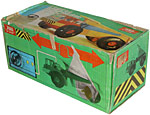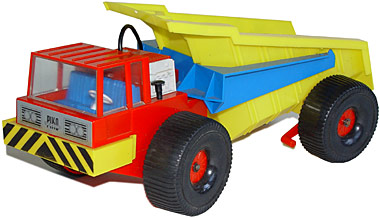Maßstab ca. 1:15, mehrteilige Karosserie, große grobstollige Räder, lenkbare Achse in der Mitte des Fahrzeuges, Ladefläche kippbar, vor- und rückwärts, Lenkung elektromechanisch