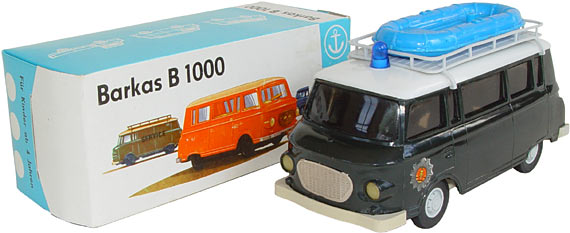 Maßstab 1:25, Kunststoffkarosserie mit Verglasung, Kühlergrill aus Blech, Scheinwerfer eingesetzt, Stoßstangenecken Teil der Bodenplatte, Vorderachse in 3 Richtungen lenkbar, weisses aufgesteck- tes Dach mit Rundumleuchte, superseltene Farbe (dunkelgrün) und rares Schlauchboot