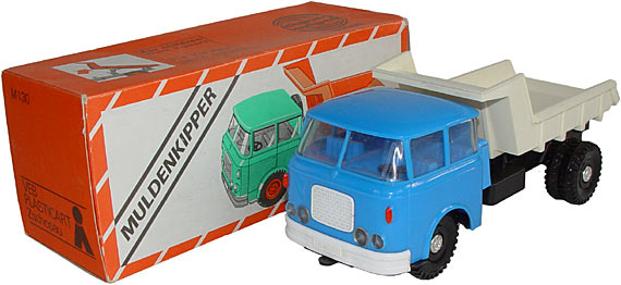 Maßstab 1:30, Kunststoffkarosserie mit Verglasung, Innenausstattung, Schwungradantrieb, Anbau-teile eingesetzte Scheinwerfer, Ersatzrad und Kasten hinter dem Fahrerhaus, Mulde zum Kippen, Zubehör Abziehbilder, Länge 23 cm