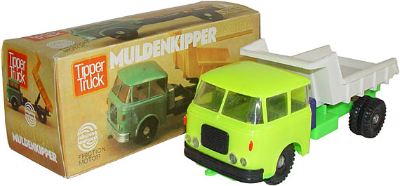 Scheinwerfer, Ersatzrad und Kasten hinter dem Fahrerhaus, Mulde zum Kippen, Zubehör Abziehbilder, Exportverpackung, Länge 23 cm