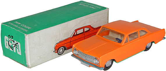 Maßstab 1:30, Kunststoffkarosserie mit Verglasung, verchromte Anbauteile und Radkappen, Schwungradantrieb, Innenausstattung, seltene GEVO-Verpackung