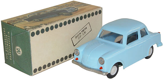 Maßstab 1:25, Kunststoffkarosserie mit Verglasung und Blechbodenplatte, Scheinwerferringe und Stoßstange aus Blech, Schwungrad, lenkbare Vorderachse, seltene OVP