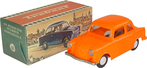 Maßstab 1:25, Kunststoffkarosserie mit Verglasung und Blechbodenplatte, Scheinwerferringe und Stoßstange aus Blech, Uhrwerk, lenkbare Vorderachse, seltene OVP