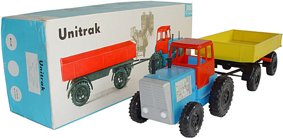 Maßstab 1:25, mehrteilige Kunststoffkarosserie ohne Verglasung, ohne Schwungradantrieb, Hänger mit kipp- und aufstellbarer Ladefläche, Gespann ca. 35 cm lang