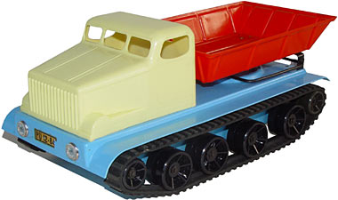 Maßstab ca. 1:15, mehrteilige Karosserie aus Weichplaste ohne Verglasung, zweite Ausführung, Kettenantrieb, Lenkung über Fernsteuerung, kippbare Mulde