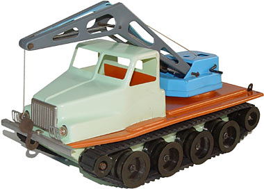 Maßstab ca. 1:15, mehrteilige Karosserie aus Weichplaste ohne Verglasung, Kettenantrieb, Lenk- ung über Fernsteuerung, erster Kranaufbau mit Haken