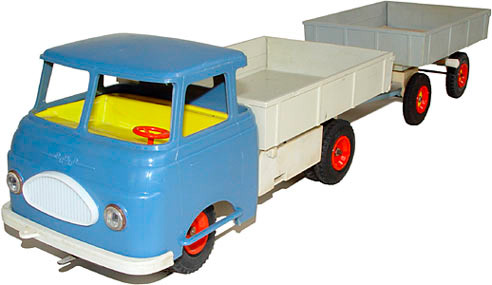Maßstab ca. 1:15, mehrteilige Karosserie aus Weichplaste ohne Verglasung, Inneneinrichtung, Lenkung über Hebel unter der Stoßstange, kippbare Ladefläche, Schwungradantrieb und seltener Hänger