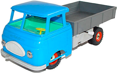 Maßstab ca. 1:15, mehrteilige Karosserie aus Weichplaste ohne Verglasung, Steuerung über Fern- lenkung, kippbare Ladefläche, Zubehör ein Hänger und die seltene Bedienungsanleitung
